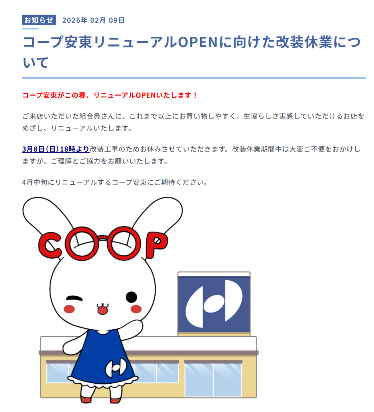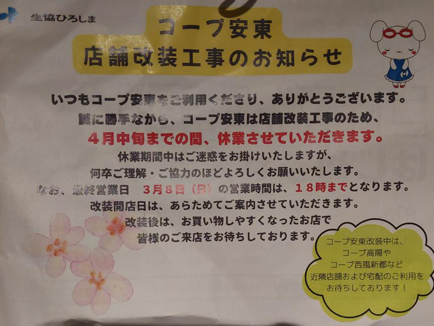 「コープ安東」が4月中旬のリニューアルに向けて一時お休みになるみたい