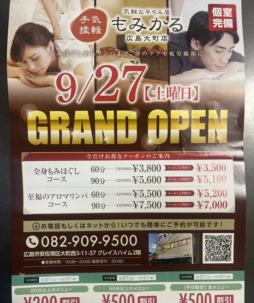 【開店情報】9/27(土)、安佐南区大町に気軽な手もみ屋「もみかる広島大町店」がオープン。着替えの無料貸出があり、手ぶらでの利用も可能。