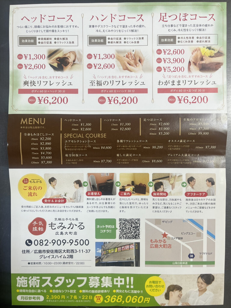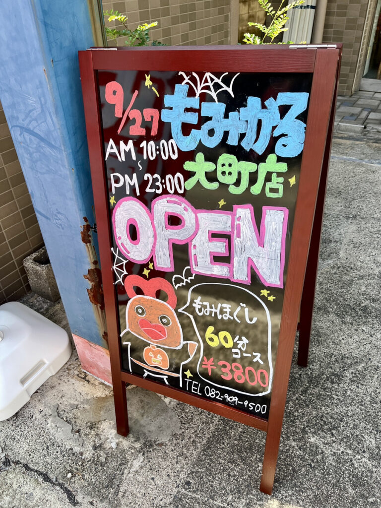 2025年9/27(土)、広島市安佐南区大町西に、気軽な手もみ屋「もみかる広島大町店」がオープンしたみたいです。
