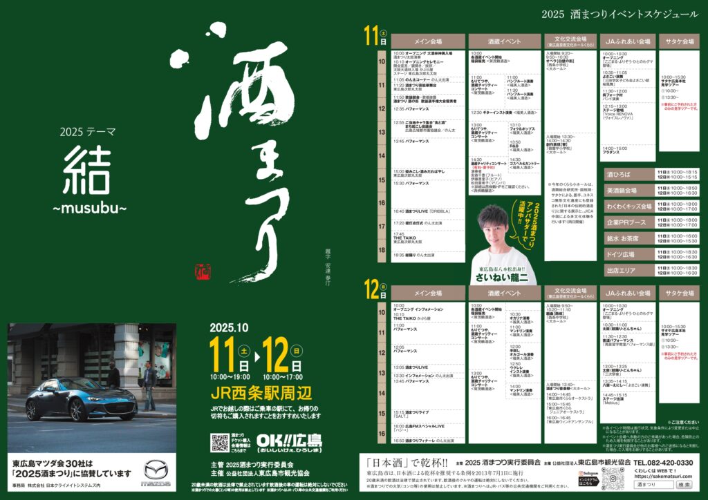【前売りチケット販売中】10/11(土).12(日) 、東広島市のJR西条駅前で『酒まつり2025』が開催。全国から約800銘柄の地酒が集まり、試飲が楽しめる。
