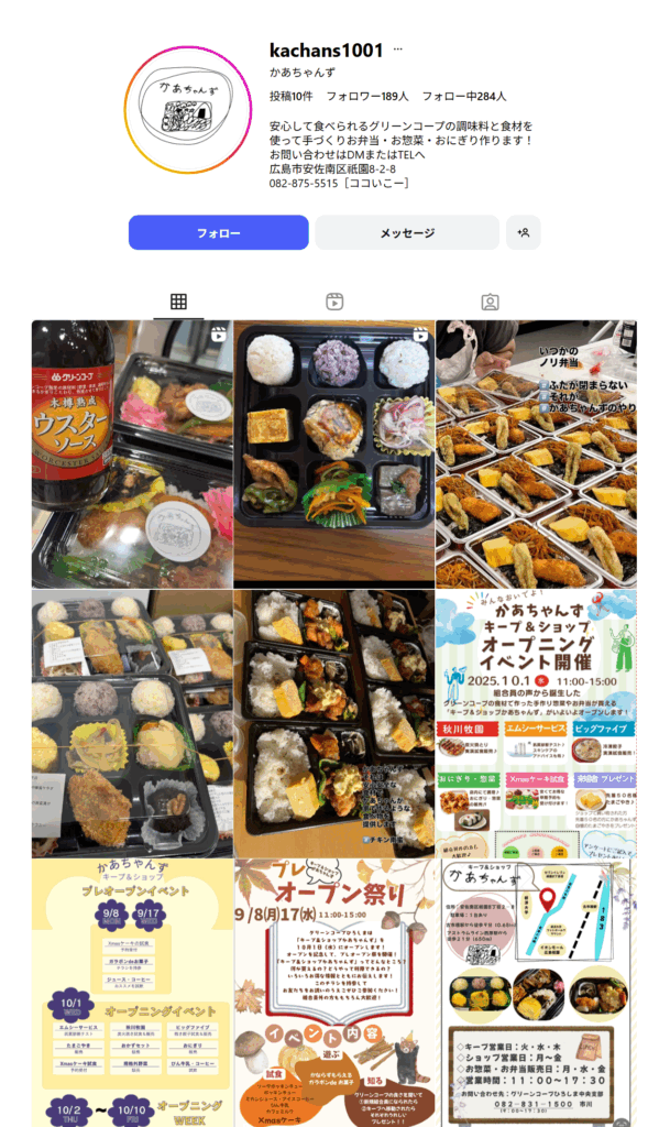 コチラは「キープ&ショップ かあちゃんず」の公式インスタグラム(@kachans1001)です。「安心して食べられるグリーンコープの調味料と食材を使って手づくりお弁当・お惣菜・おにぎり作ります!」と書かれています。