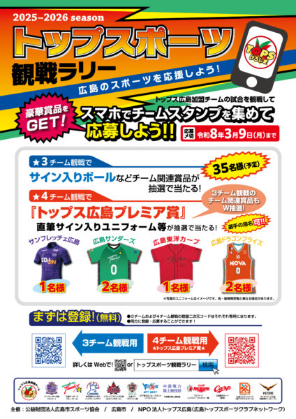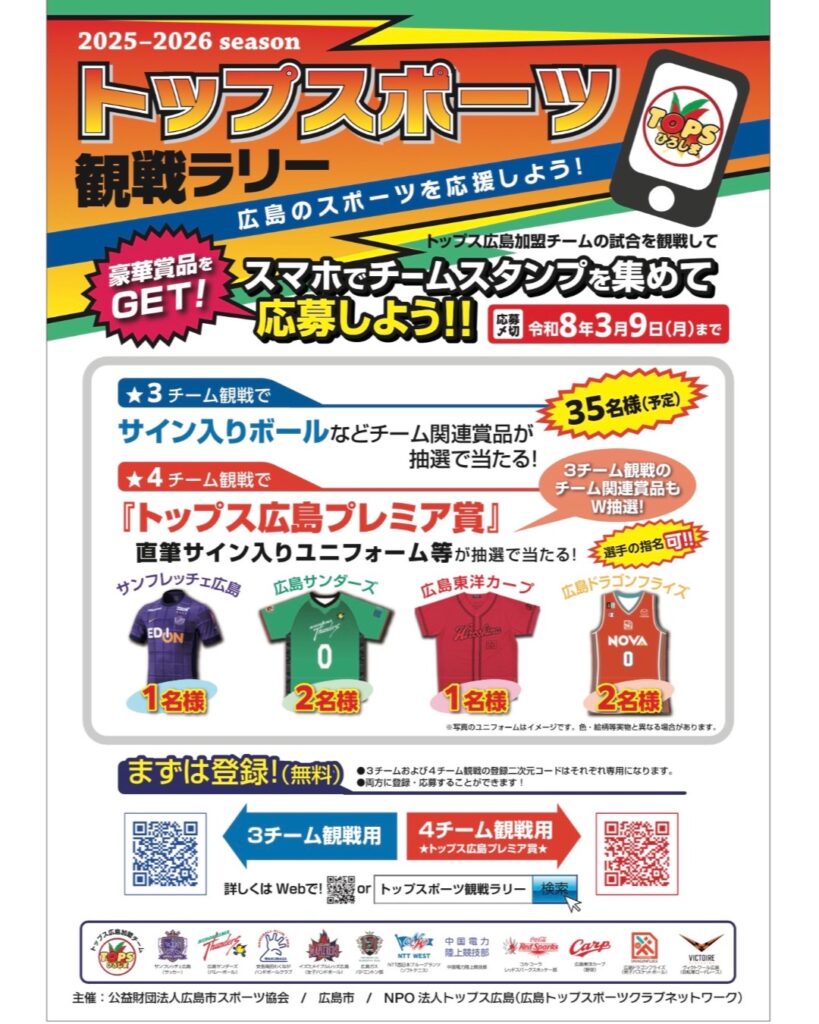 広島市スポーツ協会では、今年度もトップス広島加盟チームの試合を観戦すると豪華賞品が当たる「トップスポーツ観戦ラリー」を開催しています。