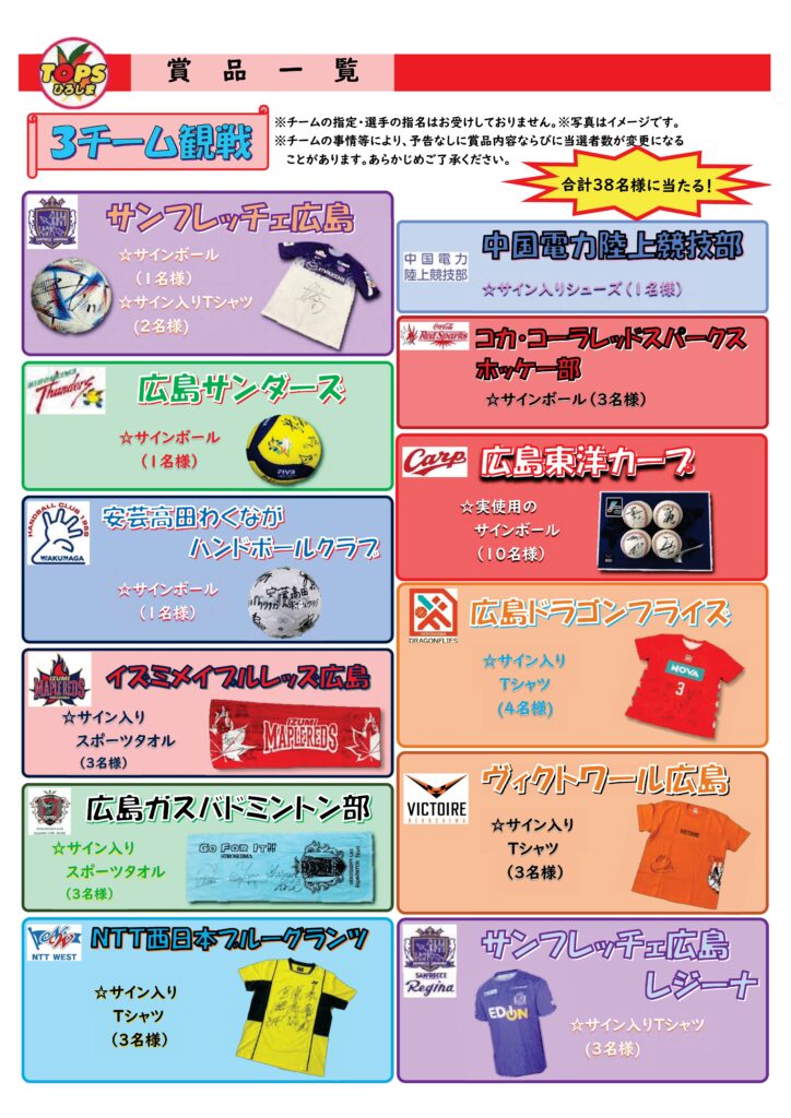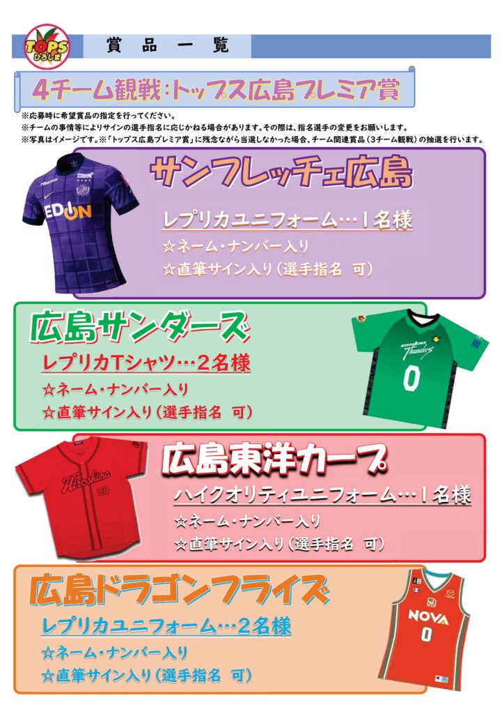 3チーム分でサインボール等のチーム関連商品、4チームで直筆サイン入りレプリカユニフォーム等の「トップス広島プレミア賞」が抽選で当たるみたい。選手の指名も可能です!