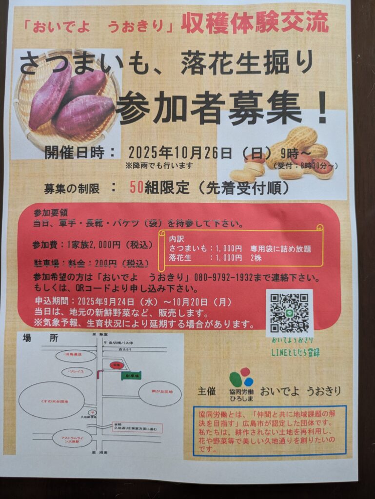 10月26日(日)に、安佐北区安佐町久地で「さつまいも、落花生掘り」の収穫イベントが開催されるみたいです。