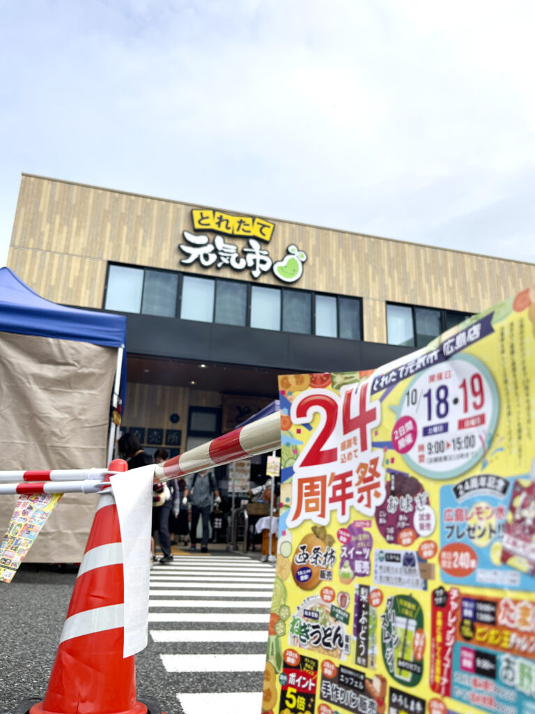広島市安佐南区大町東にある「とれたて元気市 広島店」は、広島県内の採れたての農畜産物や加工品を販売するJA全農ひろしま直営の農畜産物直売所です。今年2025年10月で24周年とのこと。おめでとうございます! これに合わせて10/18(土).19(日)の2日間、『24周年祭』を開催するということで本日、自分も行ってきました。午前中でしたが、車がかなり多かったです。多くの人たちでにぎわっていました。