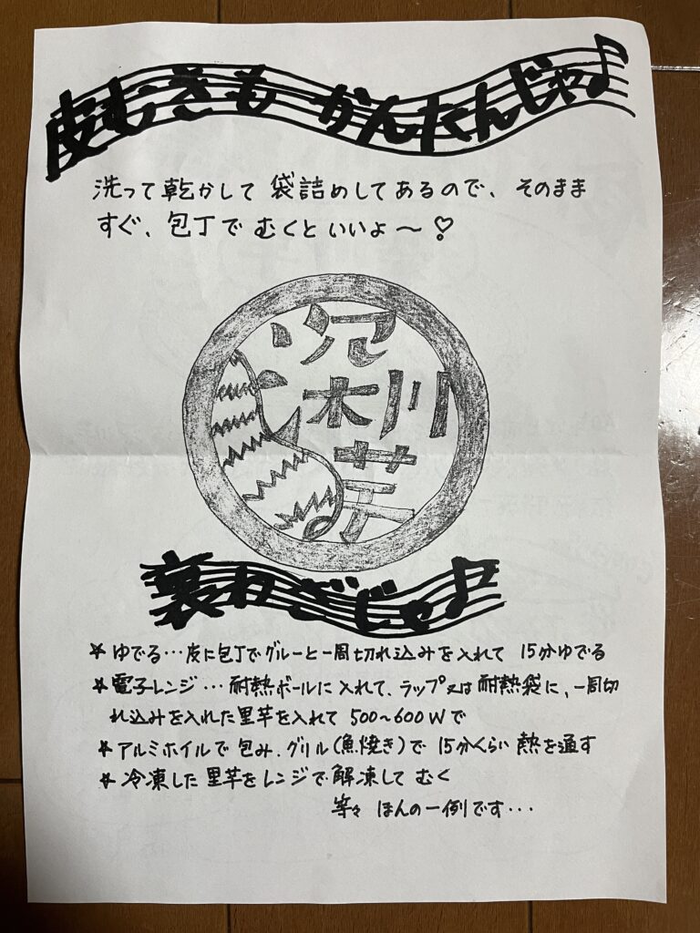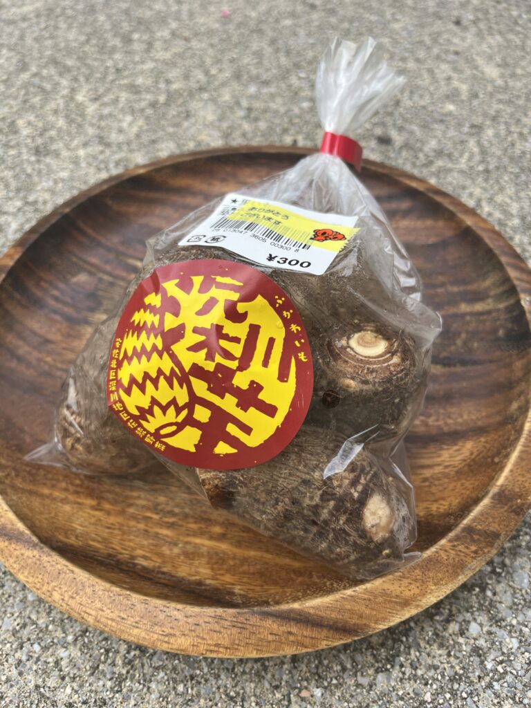 買って帰りました。ちなみに、サトイモは自分で生まれて初めて買いました。ラベルのロゴがかわいい感じですね!