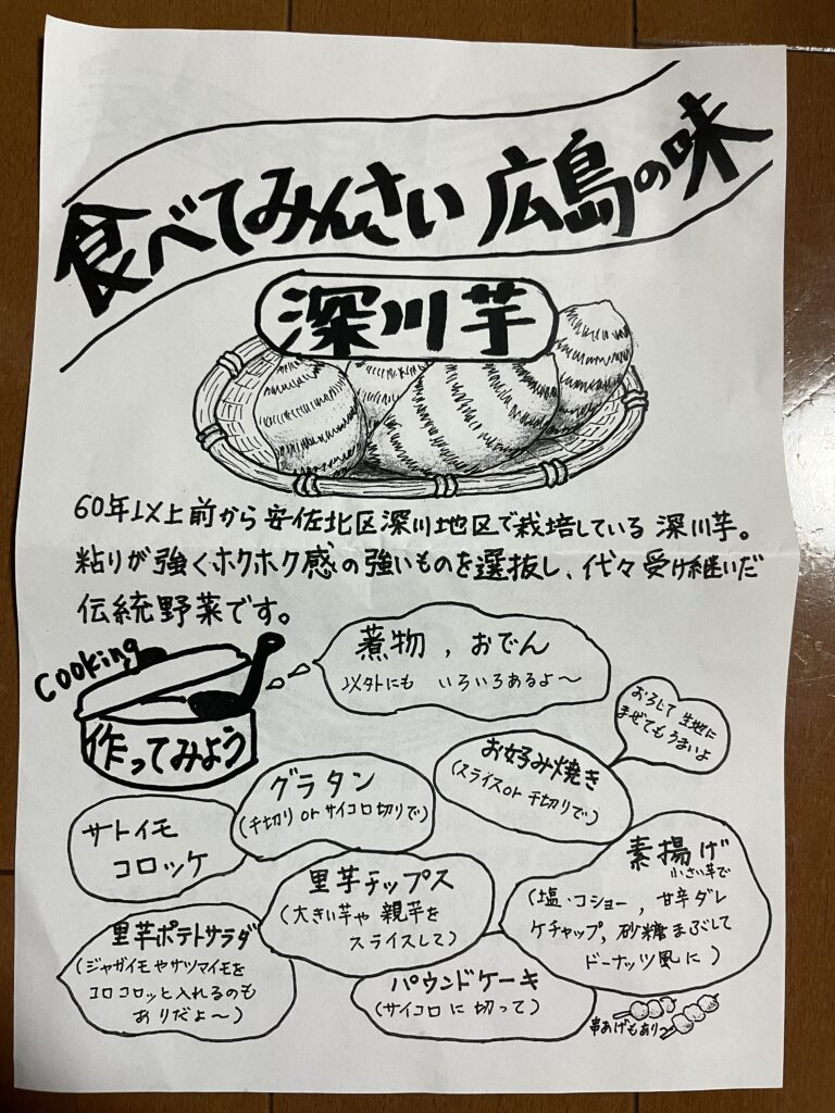 安佐北区深川地区で長年栽培されてきましたが生産者の高齢化により、存続が危ぶまれている中、安佐北区狩留家町などの農業を営む生産者グループが、「深川芋」としてブランド化に向けて力を入れているそうです。