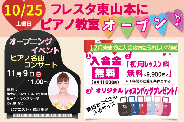 【開店情報】10/25(土)、安佐南区山本の銀山門前通りに「I Love Piano フレスタ東山本教室」がオープン。12月末まで入会金・初月レッスン料無料など特典あり。