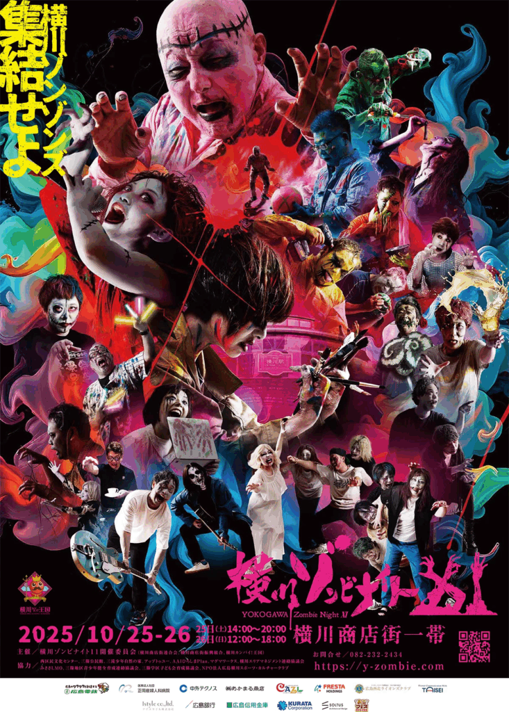 ご近所の安佐南区・安佐北区の人たちの利用が多いJR可部線と山陽本線がつながるJR横川駅周辺で、毎年恒例のハロウィンイベント『横川ゾンビナイト11』が、2025年10/25(土)と26(日)の2日間にわたって開催されます。