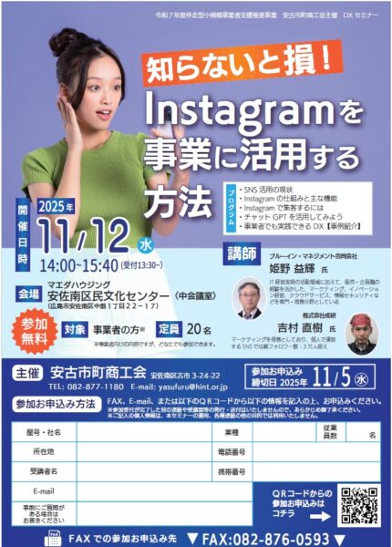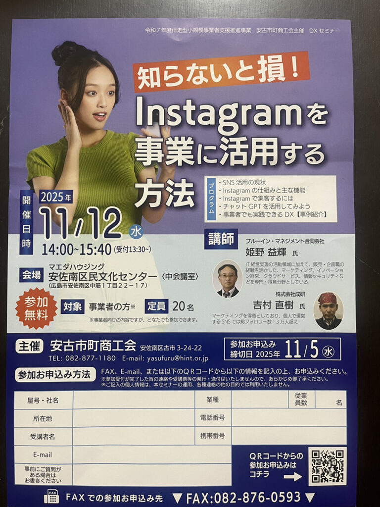 中小事業者のためのSNS活用について、11/12(水)に安古市町商工会が事業者向けのセミナー「Instagramを事業に活用する方法」を開催するみたいです。こんなチラシを見つけました▼