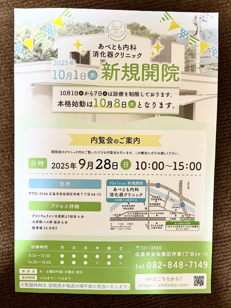 2025年10/1(水)、広島市安佐南区伴東に「あべとも内科消化器クリニック」が開院しました。おめでとうございます! コチラは9/28(日)に開催された内覧会に行ったときに緊急独占インタビューした、院長の安部真さんと副院長の安部優子さんです。ご対応、ありがとうございます!