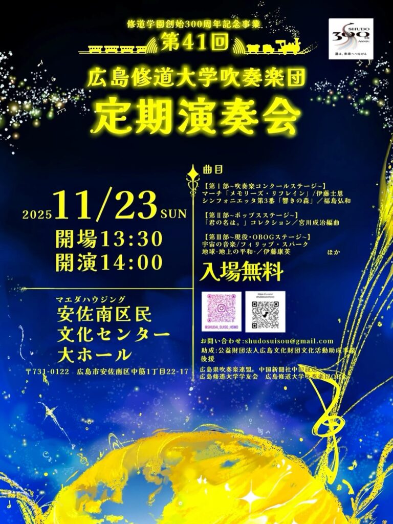 2025年11/23(日)、修道学園創始300周年記念事業として『第41回 広島修道大学吹奏楽団定期演奏会』が開催されます。マエダハウジング安佐南区民文化センターの大ホールです。入場無料です。開場13:30、開演14:00からです。