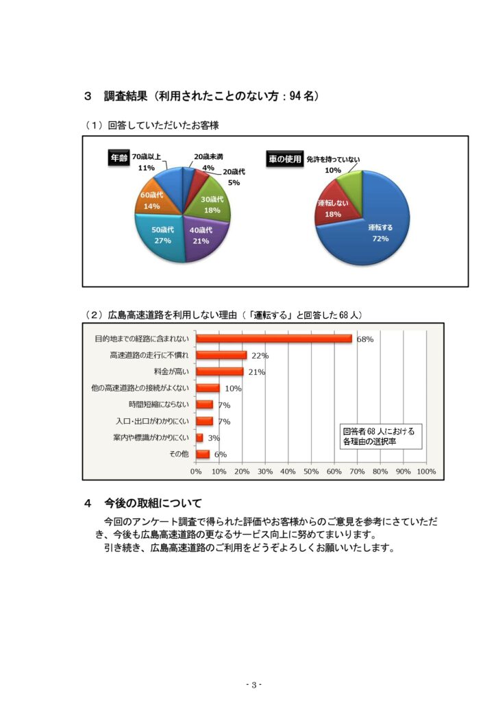アンケート内容を見てみると、「公社HPに掲載している『道路交通情報』ページのアクセス頻度」「料金が高いと感じることを理由に、広島高速の利用距離を短くする(目的地よりも手前の出口で降りるなど)ことがありますか」「有料道路である広島高速の利用を判断する際に、割引の有無は影響しますか」などありました。