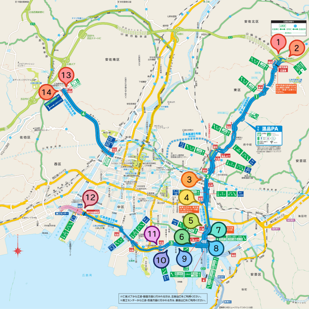 広島高速道路は、広島市とその周辺地域の自動車専用道路ネットワークです。現在、広島高速1号線(安芸府中道路)、広島高速2号線(府中仁保道路)、広島高速3号線(広島南道路)、広島高速4号線(広島西風新都線)、広島高速5号線(東部線)の5路線約29kmを令和10年度(2028年度)までに整備することになっており、現在、広島高速1~4号線までの4路線25kmが供用されており、通勤や物流、レジャーなど、広島広域都市圏の交通を支える重要な役割を担っています。