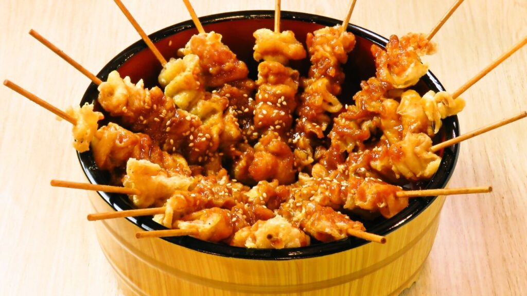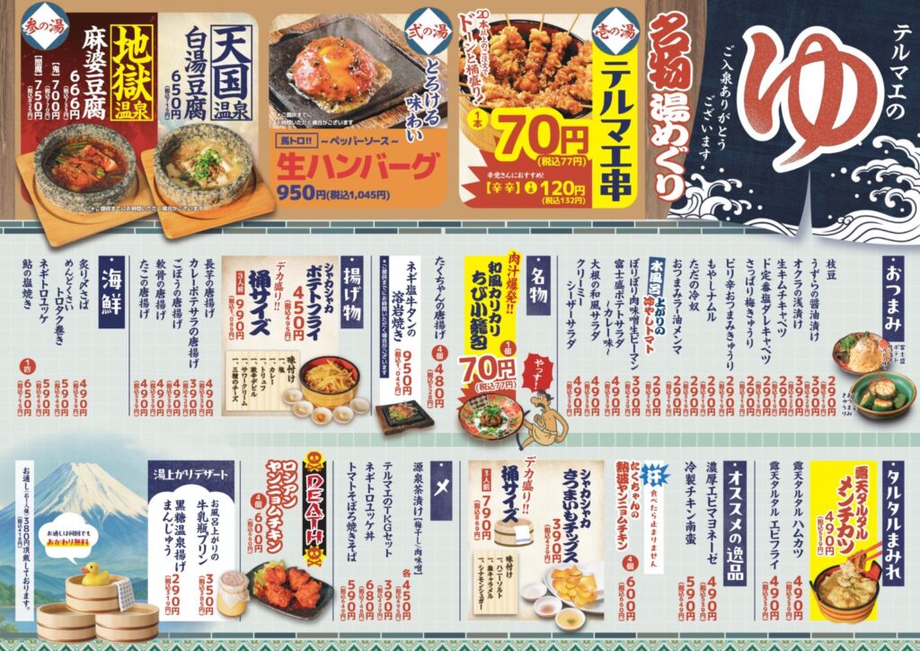 風呂桶に盛られたテルマエ串(20本以上の注文で)、カリっと揚げた小籠包、SNS映えしそうな生ハンバーグなど幅広く揃っているようです。
