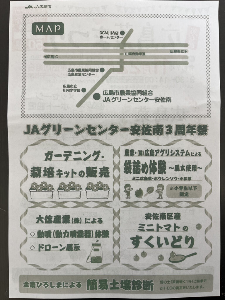 JAグリーンセンター安佐南は3周年を迎えるそうで、3周年祭も同時に開催されます。