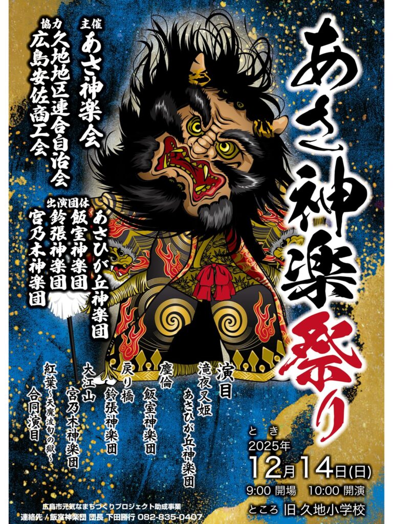安佐北区安佐町の神楽4団体が集結する「あさ神楽会」が主催し、旧・久地小学校体育館で『あさ神楽祭り』が開催されるそうです。出演団体は、あさひが丘神楽団、飯室神楽団、鈴張神楽団、宮野木神楽団です。