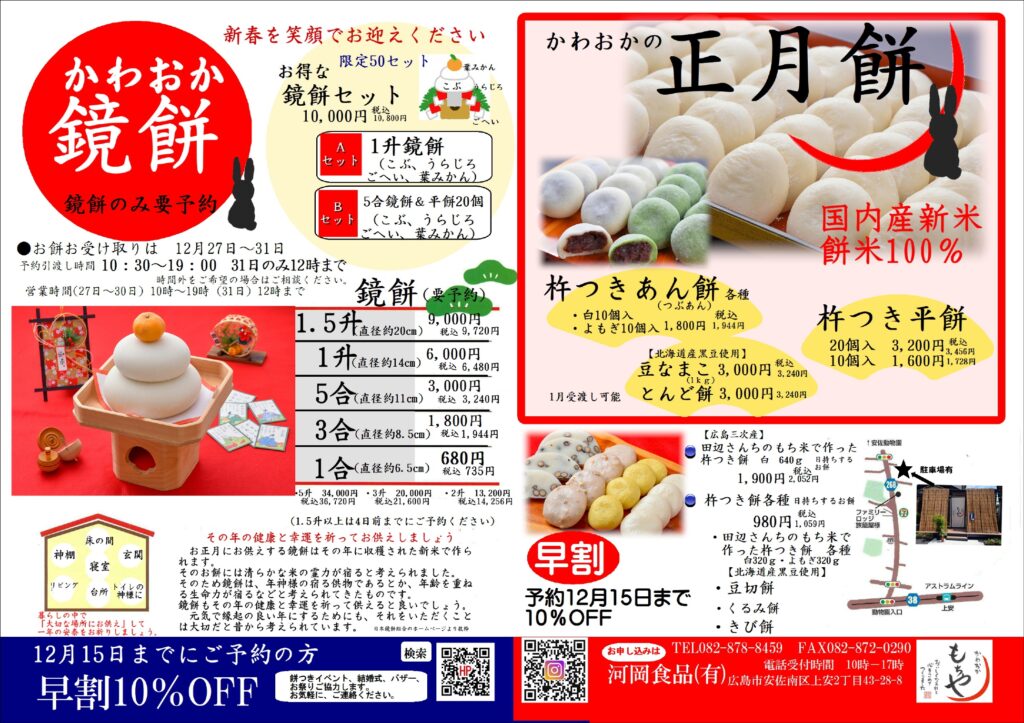 安佐南区上安にある、おいしいお餅や和菓子でおなじみの「河岡食品(もちや)」から、お正月用のお餅に関するニュースが入ってきましたよー。