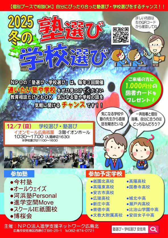 2025年12/7(日)に『2025冬の塾選び+学校選び』が開催されます。会場はイオンモール広島祇園です。このイベントは、広島市安佐南区にある実力派個人塾が集まり、塾の雰囲気や勉強の気になることや困ったことなどが個別ブースで1対1で相談できるイベントです。一度にいろんな塾の話が聞けて、パンフレットもまとめて入手できるいい機会です。