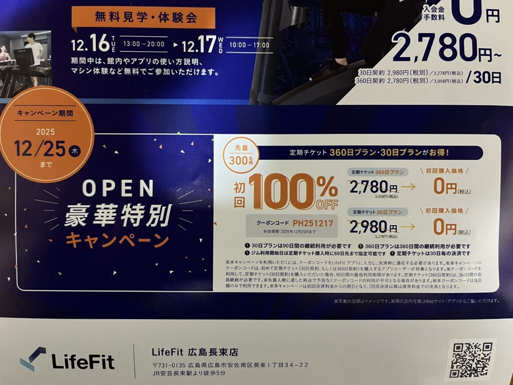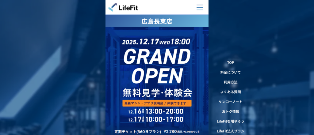 12/16(火).17(水)の2日間、無料見学・体験会を開催するみたいです。コチラは「LifeFit 広島長束店」(ライフフィット)公式ホームページです。