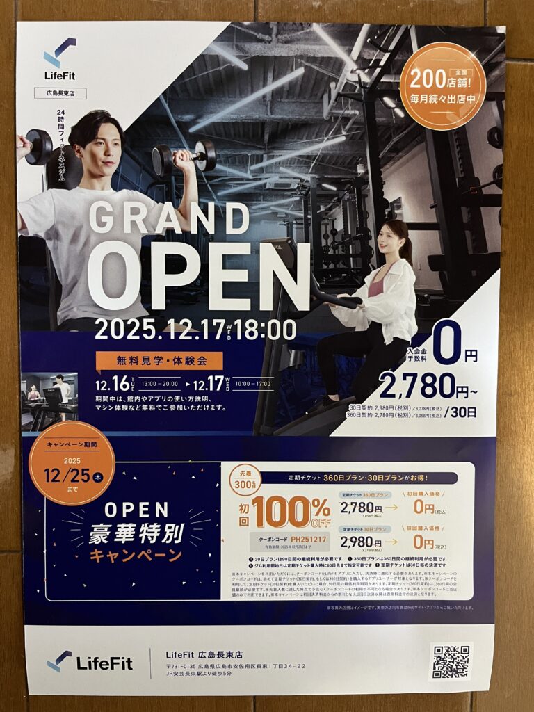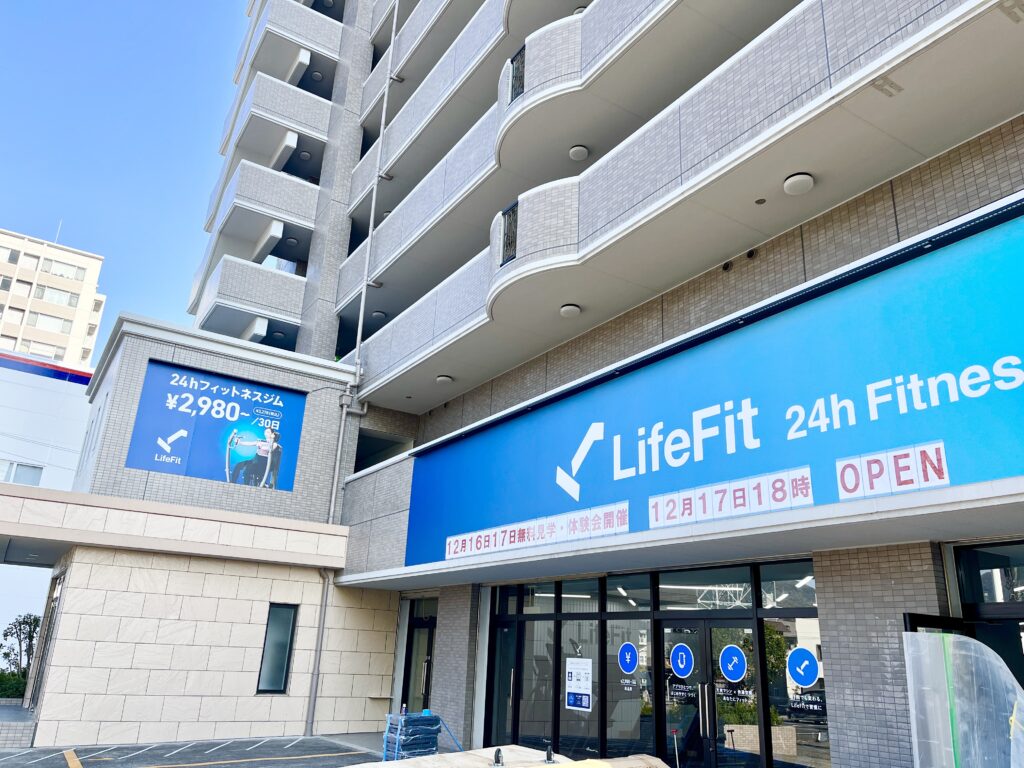 ということで行ってきました。コチラが24時間フィットネスジム「LifeFit 広島長束店」(ライフフィット)です。2025年12/17(水)18時にオープンするようです。おめでとうございます!
