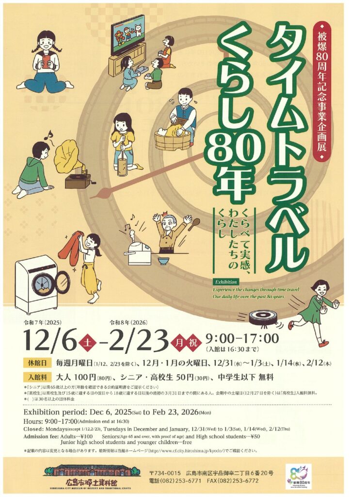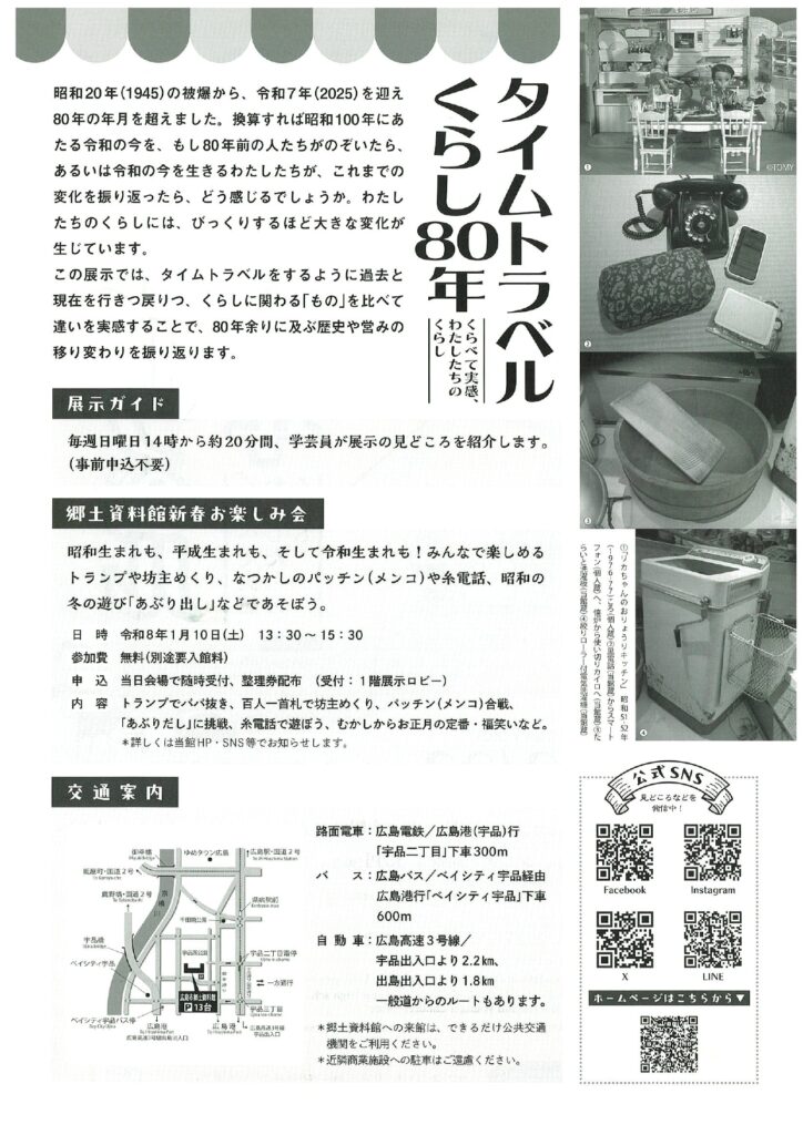 広島市南区宇品の「広島市郷土資料館」で、企画展『タイムトラベルくらし80年~くらべて実感、わたしたちのくらし』が開催されています。 戦後から現在までの80年間で、衣食住や子供の遊び、情報機器などがどのように変化したのかを、実物資料を通して紹介する展示です。