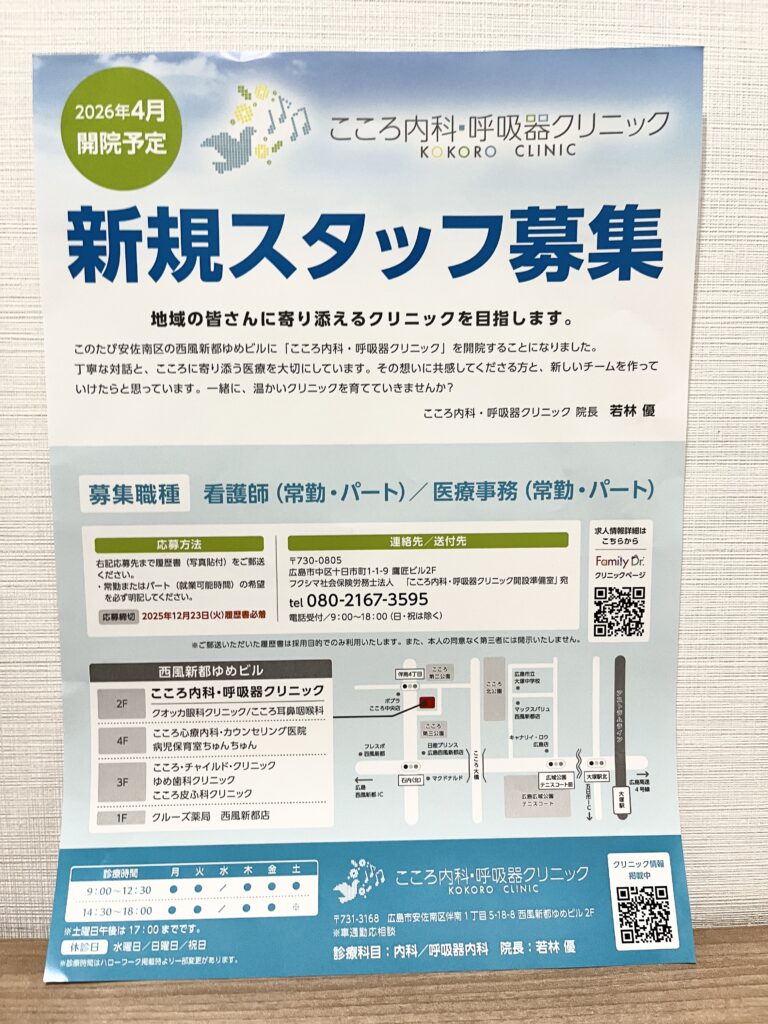 【開院速報】2026年4月、安佐南区伴南の西風新都こころ団地で「こころ内科・呼吸器クリニック」がオープン。土曜診療は17時まで。特徴をまとめてみた。