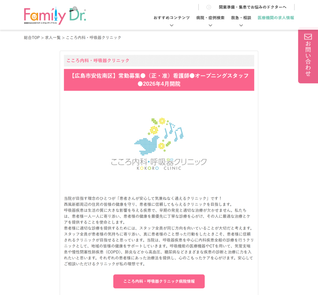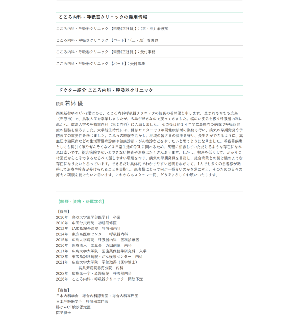 求人募集の掲載ページも見つけました。ここには「こころ内科・呼吸器クリニック」の特徴や、院長の若林優先生のキャリアについて紹介されていました。そこからざっくりと特徴をまとめてみました。
