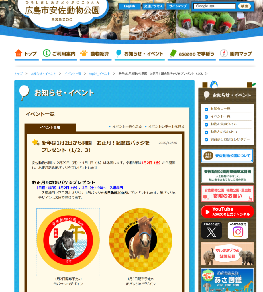 「広島市安佐動物公園」の年末年始は12/29(月)から休園し、1/2(金)から年始がスタート。2(金).3(土)は正月記念のオリジナルの缶バッジのプレゼントがあるそうです。先着200名とのことです。コチラは広島市安佐動物公園公式ホームページです。