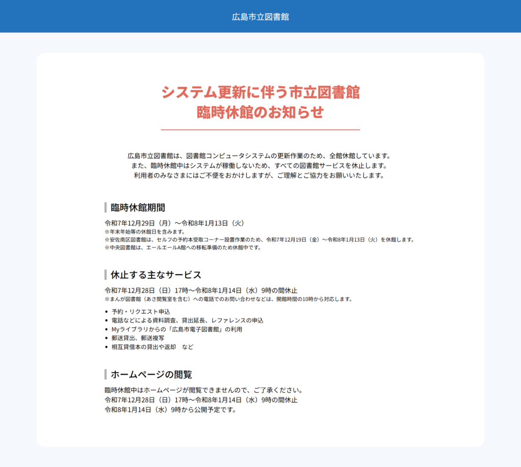 今回の全館臨時休館は、図書館のコンピュータシステムを新しく更新するためだそうです。年末年始のお休み(2026年12月29日〜1月4日)に続けて、システム入れ替えのための作業期間として1月13日(火)までお休みになるというわけですね。