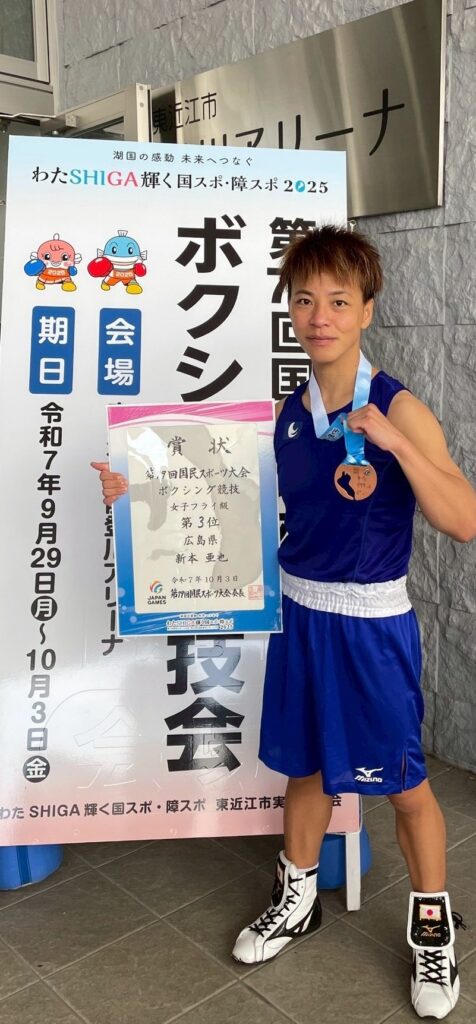 直後の中国ブロック大会で優勝し、2025年9月28日から10月8日にかけて滋賀県で開催された『第79回国民スポーツ大会(わたSHIGA輝く国スポ)』のボクシング競技には広島県代表として出場。並み居る強豪を破って見事、成年女子3位に輝きました。おめでとうございます!