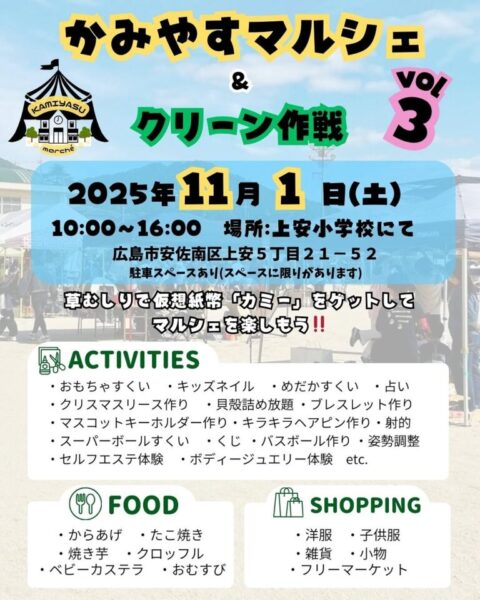昨年2025年11/1(土)にPTA主催による『かみやすマルシェ&クリーン作戦 vol.3』が広島市立上安小学校で開催されました。そのときの記事はコチラです。