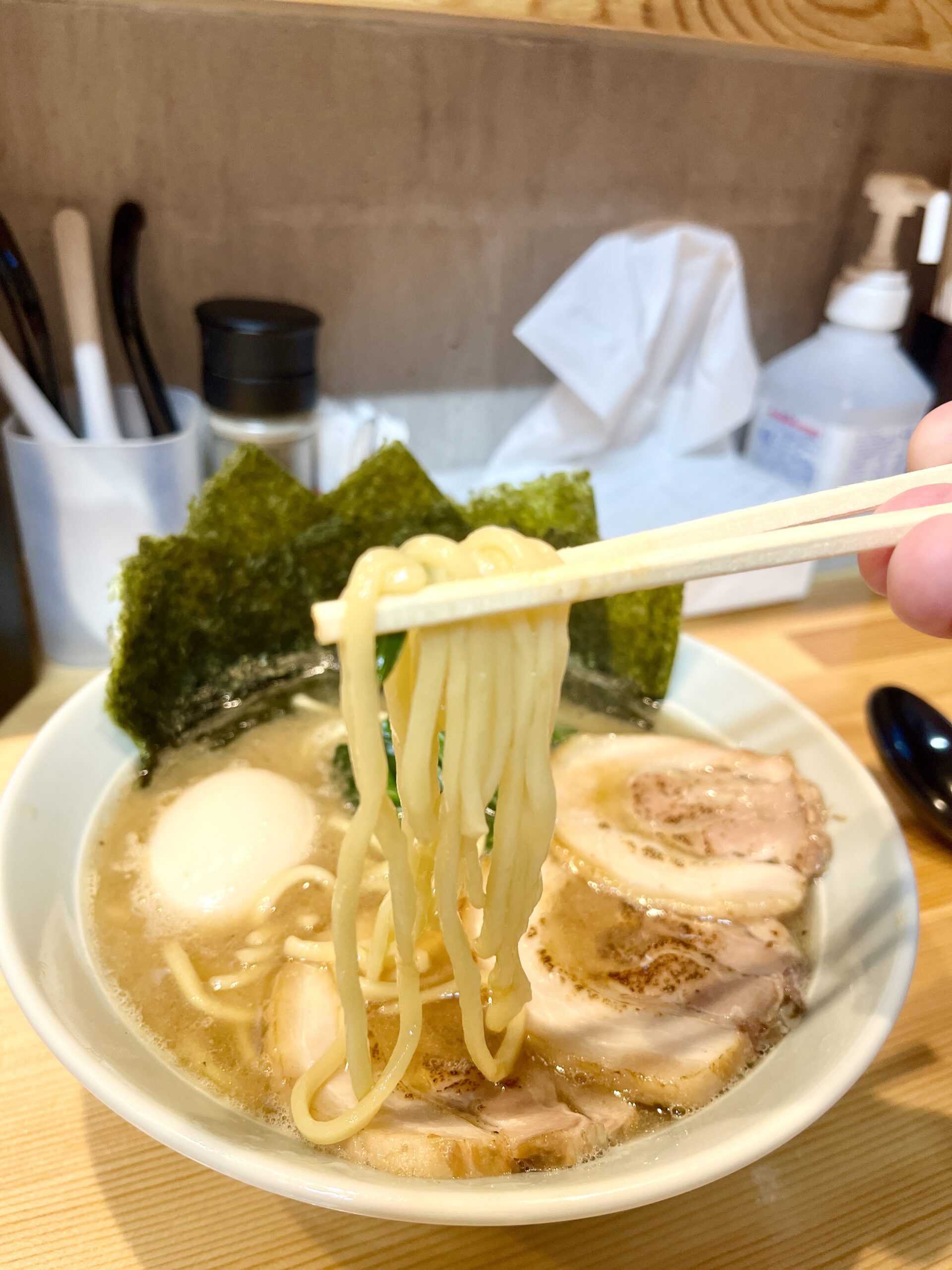 スープは「かえし」と呼ばれる醤油のタレをベースに、豚骨を煮込んだスープで完成させています。二郎系や家系といえば、濃厚でこってりしたスープの方が多い気がしますが、この店はやさしい感じで、あっさりしています。