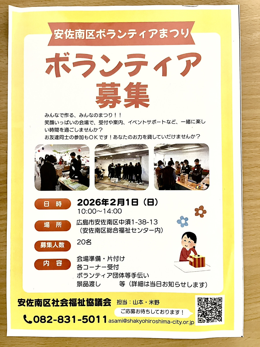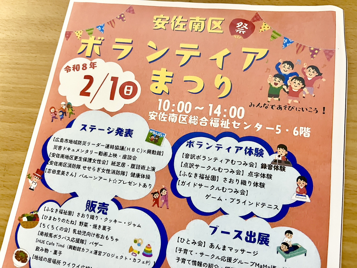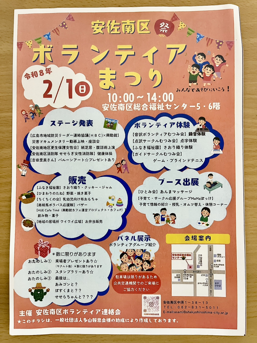 安佐南区ボランティア連絡会は2026年2月1日(日)、広島市安佐南区中須の「安佐南区総合福祉センター」で、『安佐南区ボランティアまつり」を開催するそうです。