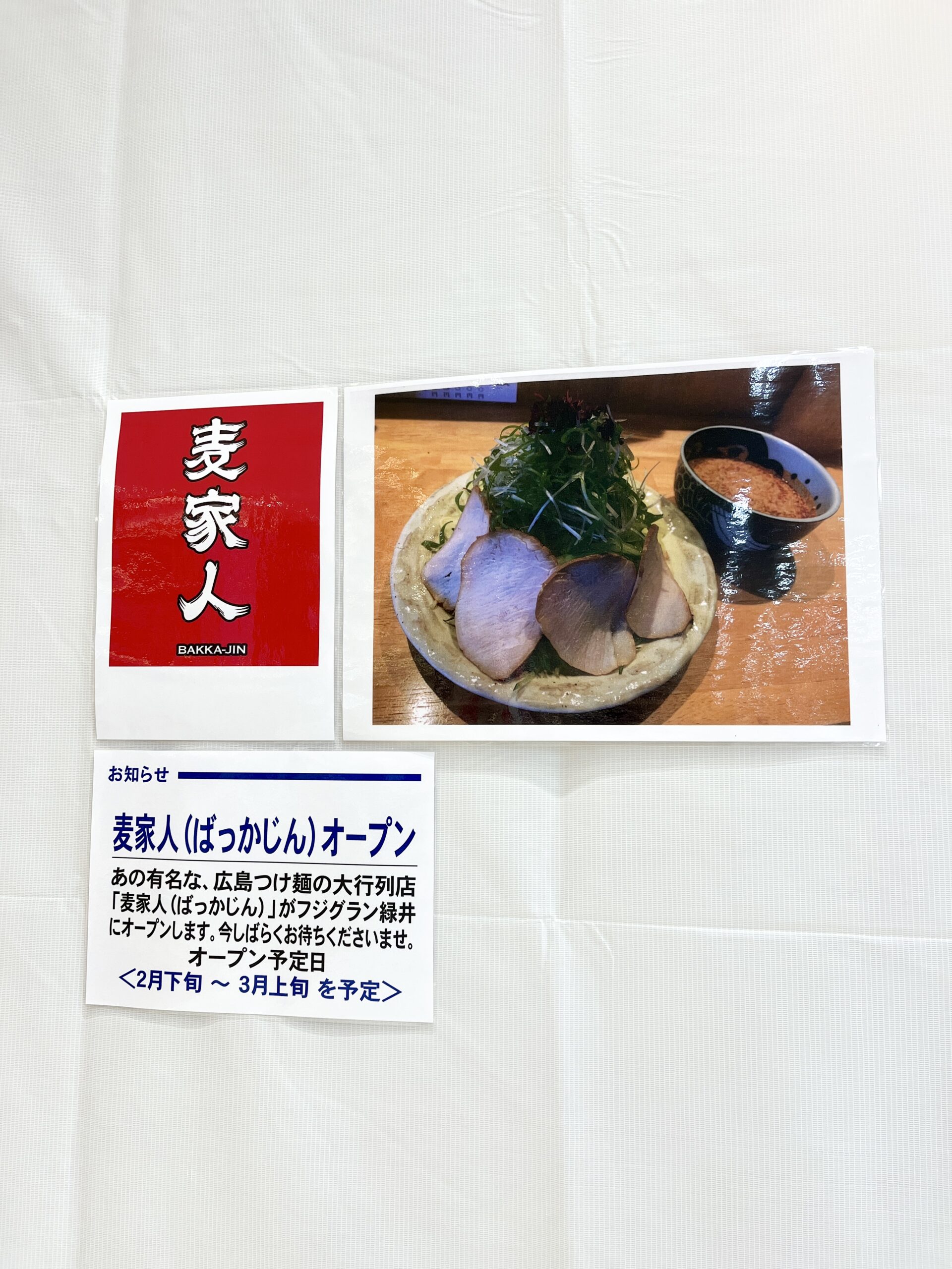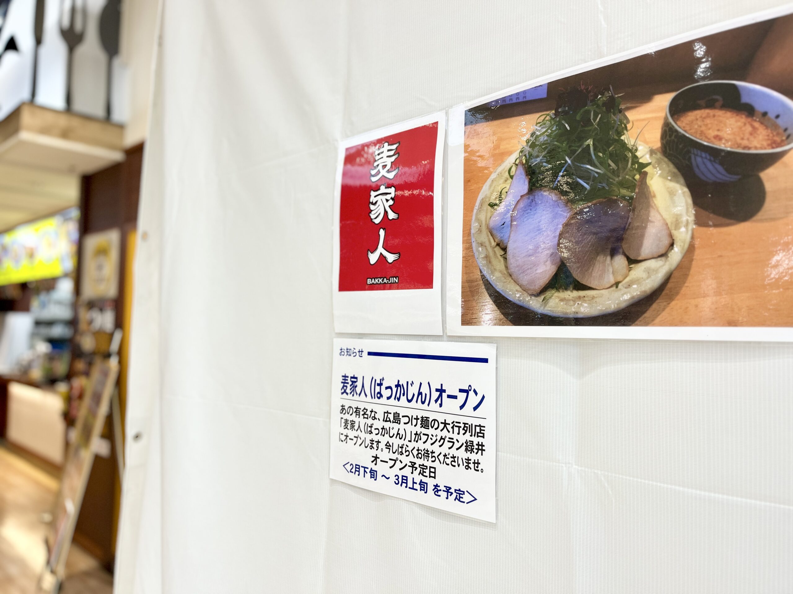 「フジグラン緑井の2Fフードコート、100時間カレーがあったところに、麦家人(ばっかじん)ができるそうです」