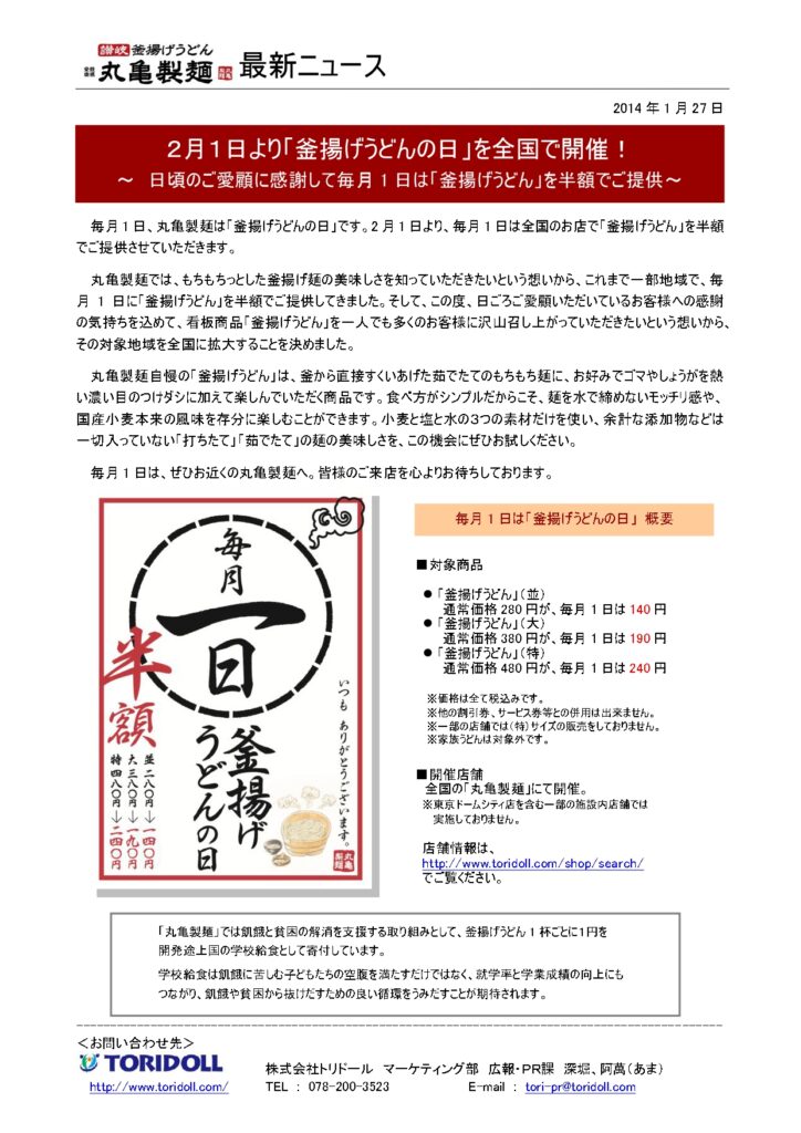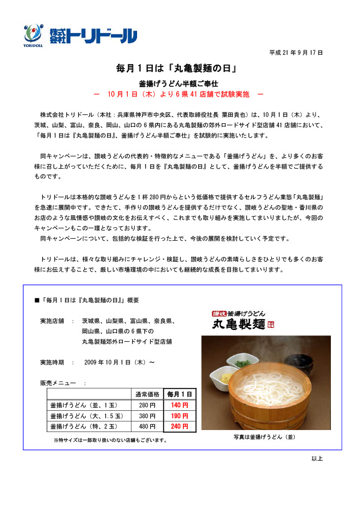 調べてみると、意外に以前からスタートしていました。まずは2009年10/1から試験的に実施。茨城、山梨、富山、奈良、岡山、山口の6県内にある丸亀製麺の郊外ロードサイド型店舗41店舗で、「毎月1日は『丸亀製麺の日』、釜揚げうどん半額ご奉仕」をはじめたようです。