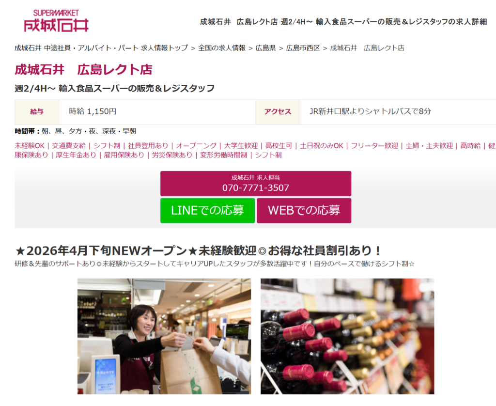 広島県内では「ミナモア広島」の2Fにある「成城石井 広島駅店」に続けて、2店舗目となります。広島駅だと車では行きにくいなあ、、、と思っていた人には「LECT」(レクト)のオープンはうれしいですね。コチラは「成城石井 広島レクト店」求人情報です。ここには2026年4月下旬オープンと書かれています。時給は1150円です。