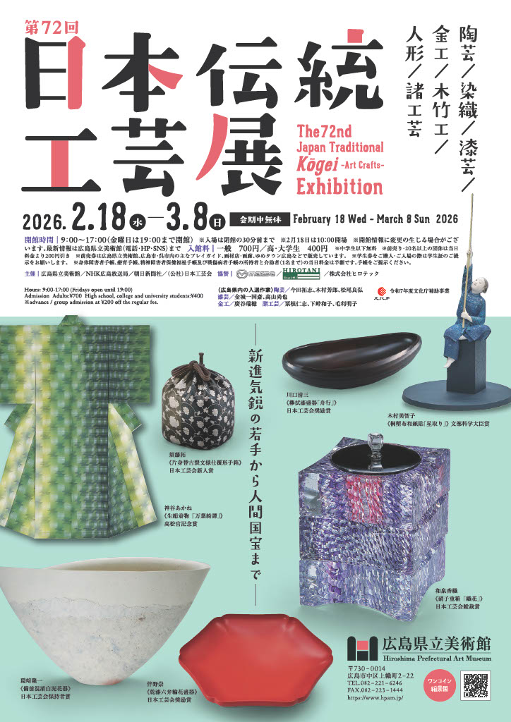 2026年2月18日(水)から3月8日(日)まで、広島県立美術館(広島市中区上幟町)で「第72回日本伝統工芸展」が開催されます。