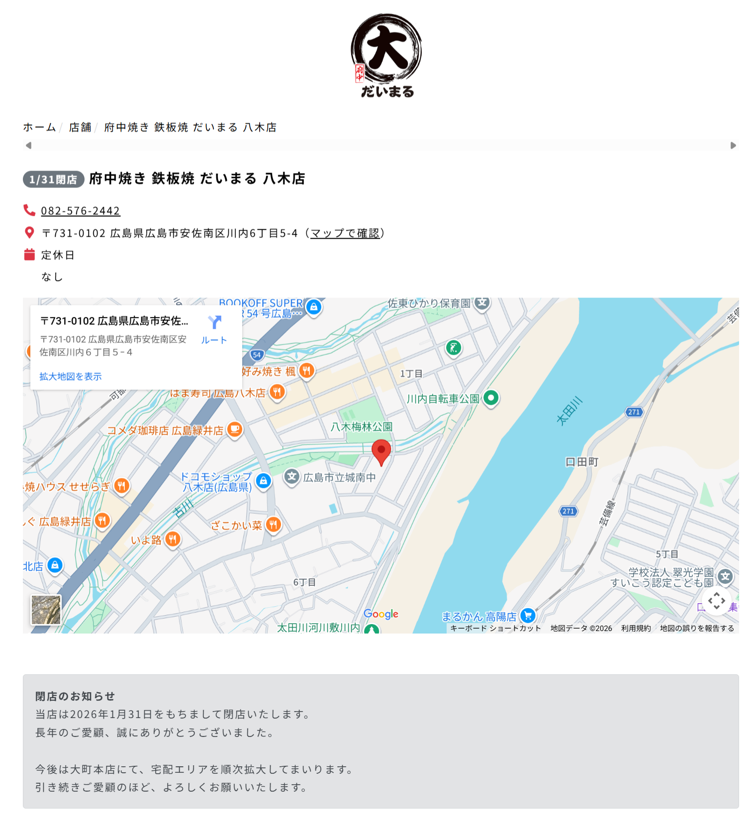 【閉店情報】1/31(土)で安佐南区川内の「府中焼き鉄板焼 だいまる 八木店」が閉店。今後は大町本店で宅配エリアを拡大へ。いままでありがとうございました。