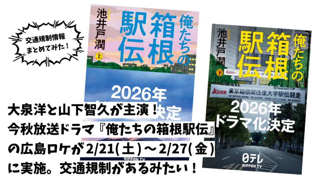 「こんにちは。安佐南区のイベント情報ではないのですが、日テレドラマで池井戸潤原作『俺たちの箱根駅伝』のエキストラを募集しているみたいです! 広島城や白島駅付近などを走る撮影の観客役だそうです。楽しそうなので共有させていただきます♪」