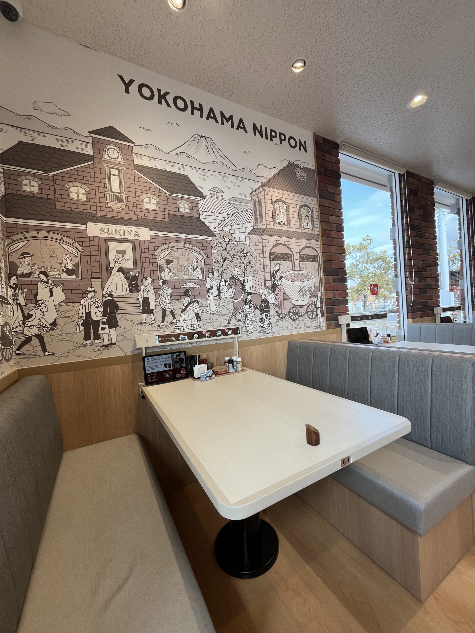 ソファ席には「すき家」と同じゼンショーグループの「はま寿司」と同じ、流れるタッチパネルがありました。