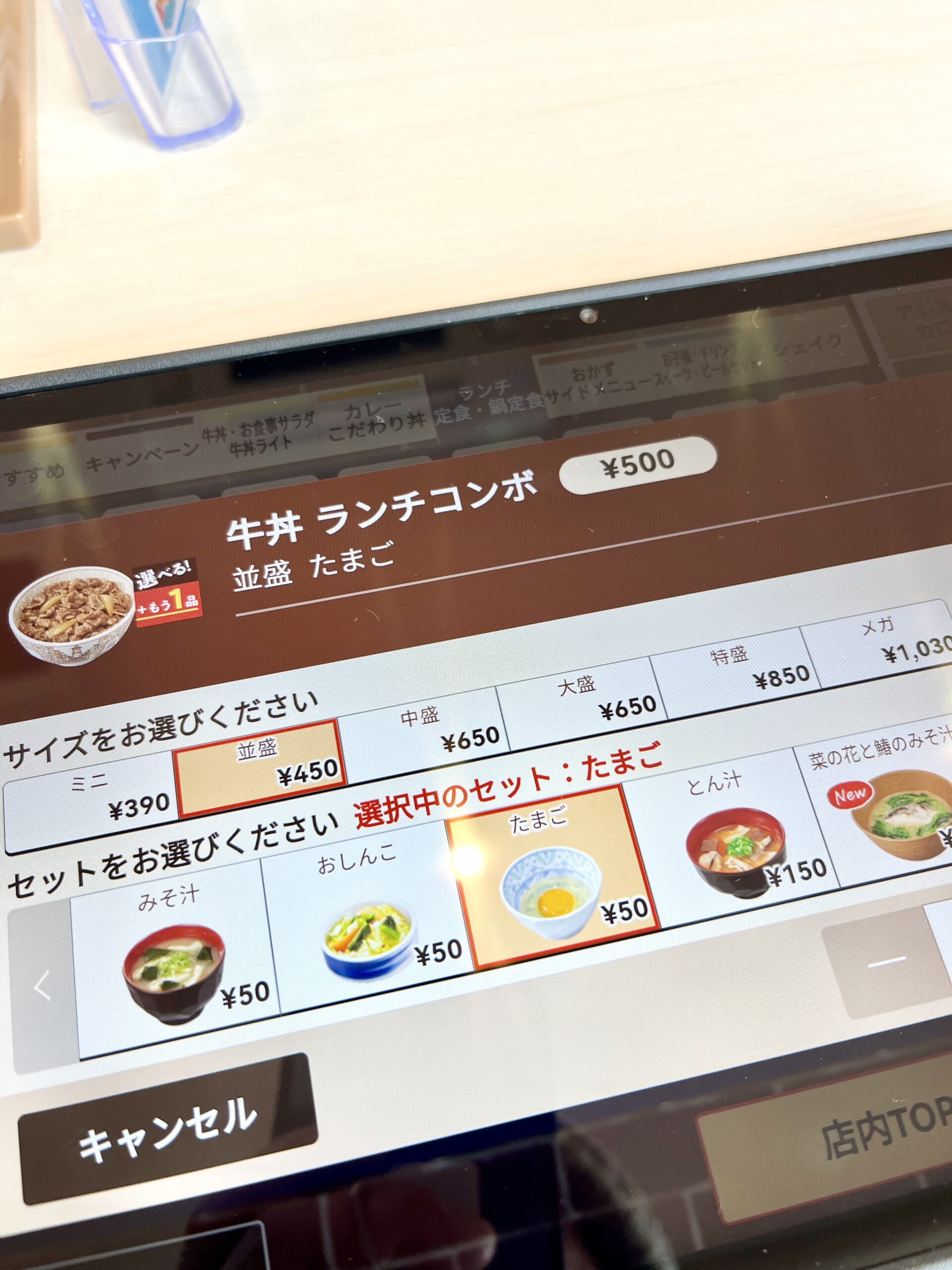 500円のお得なランチセットは、牛丼並盛+生卵を注文しようと思いました。