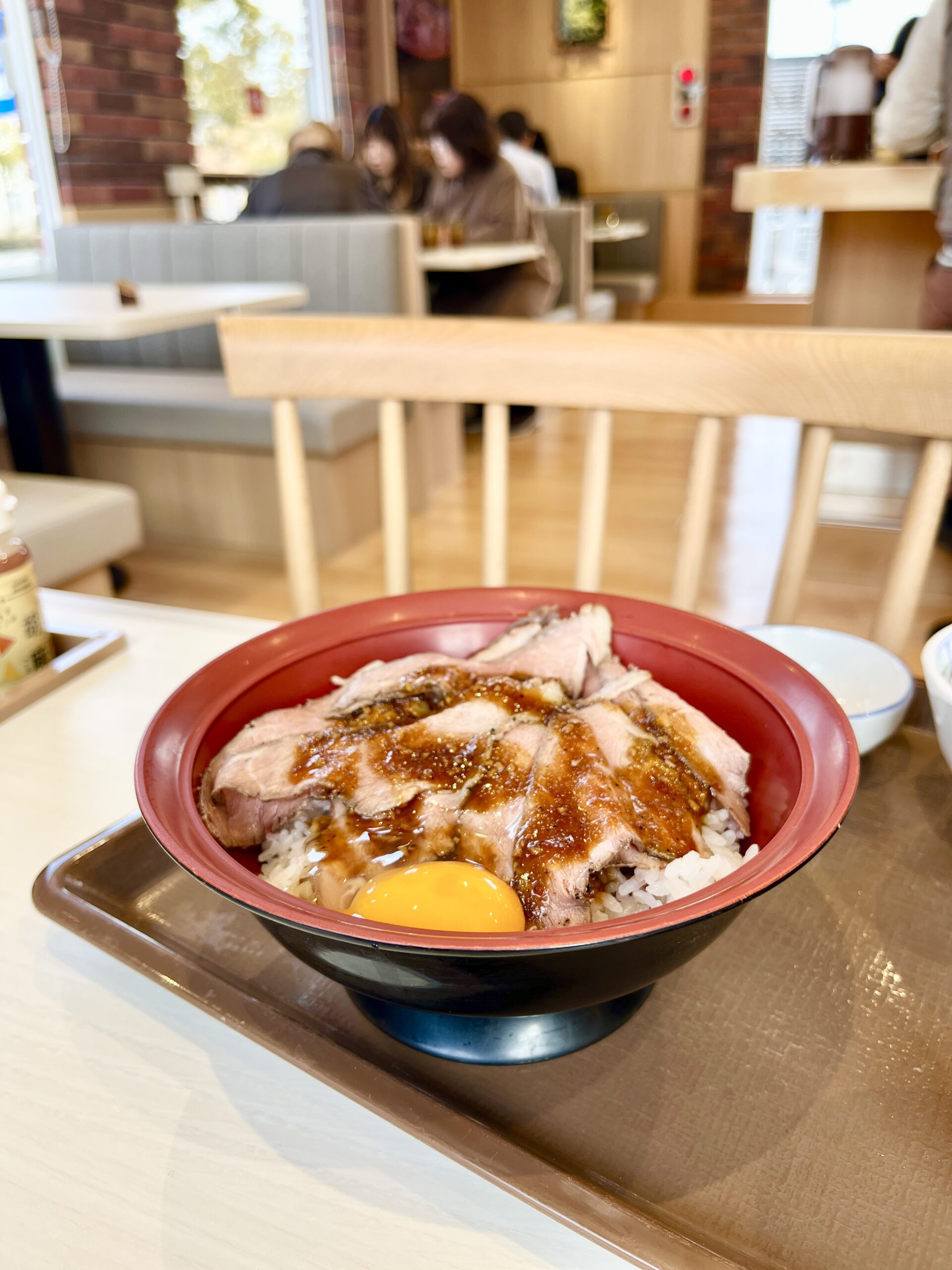 卵黄をローストビーフ丼の中央に配置しようとしましたが、端っこに。。。おそらく正しいやり方があるのでしょう。