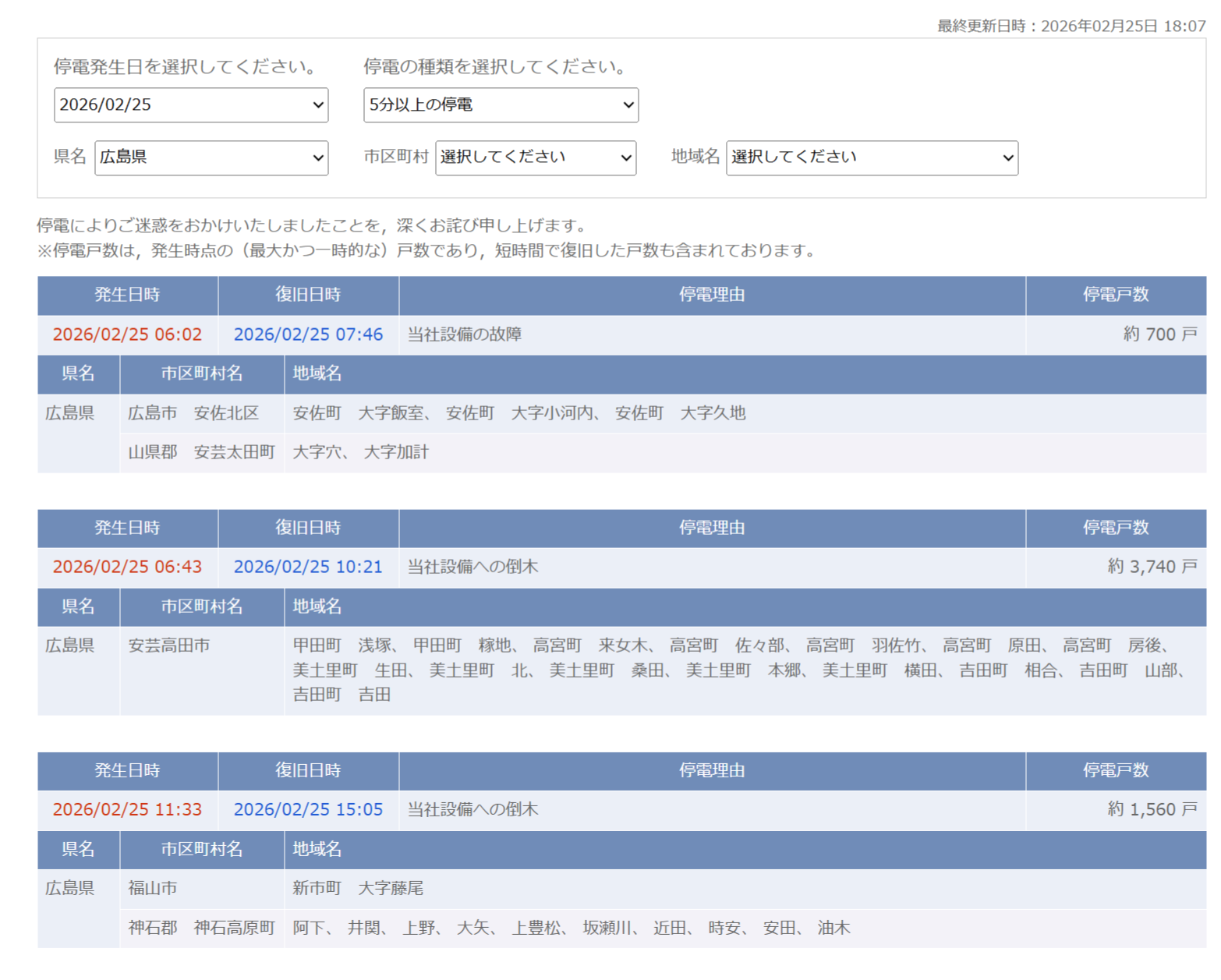 情報元である「中国電力ネットワーク 過去の停電」を見ると、同じく朝6時頃、安芸高田市でも設備への倒木が原因で停電が発生し、約3740世帯が影響を受けたそうです。