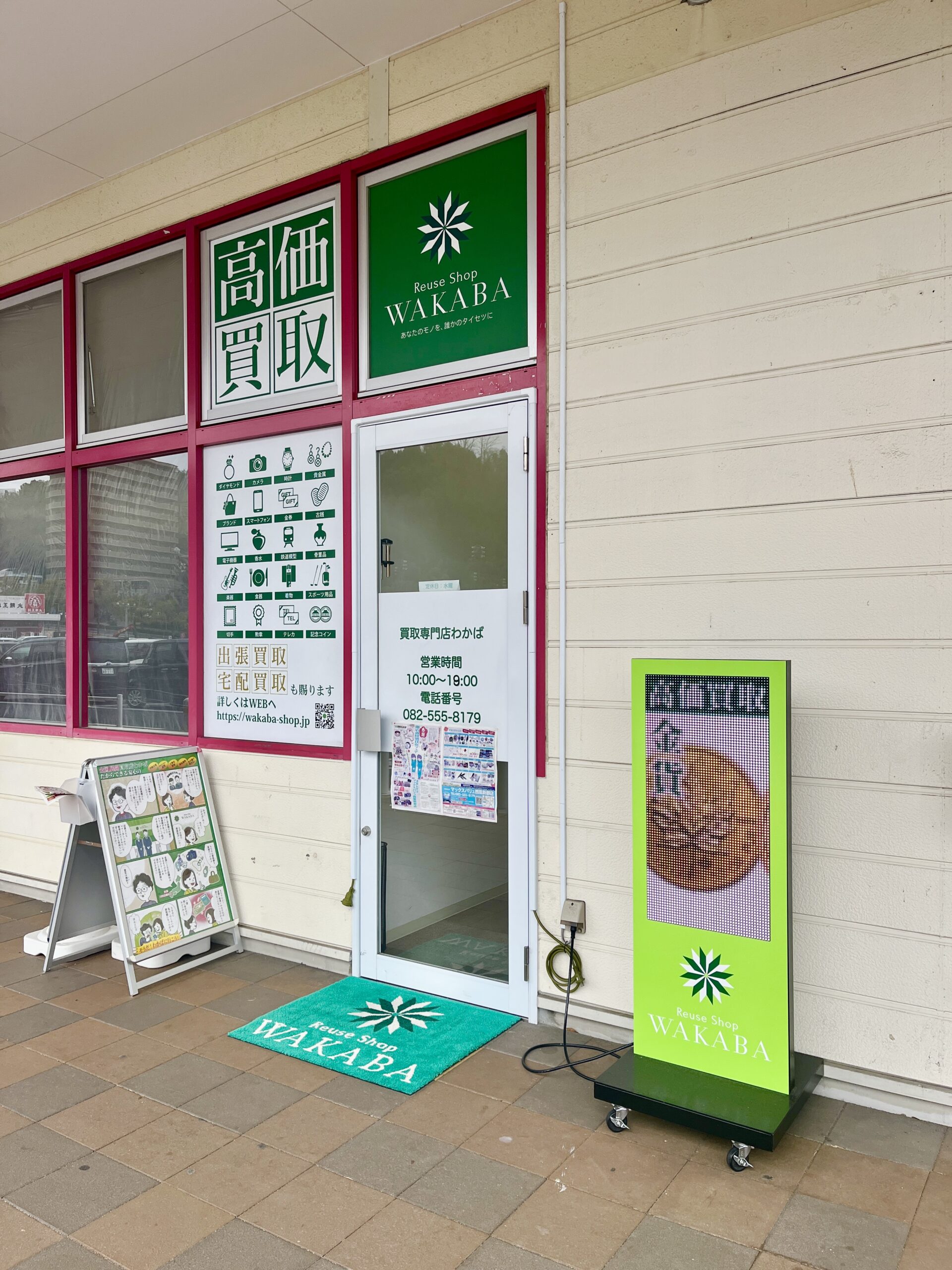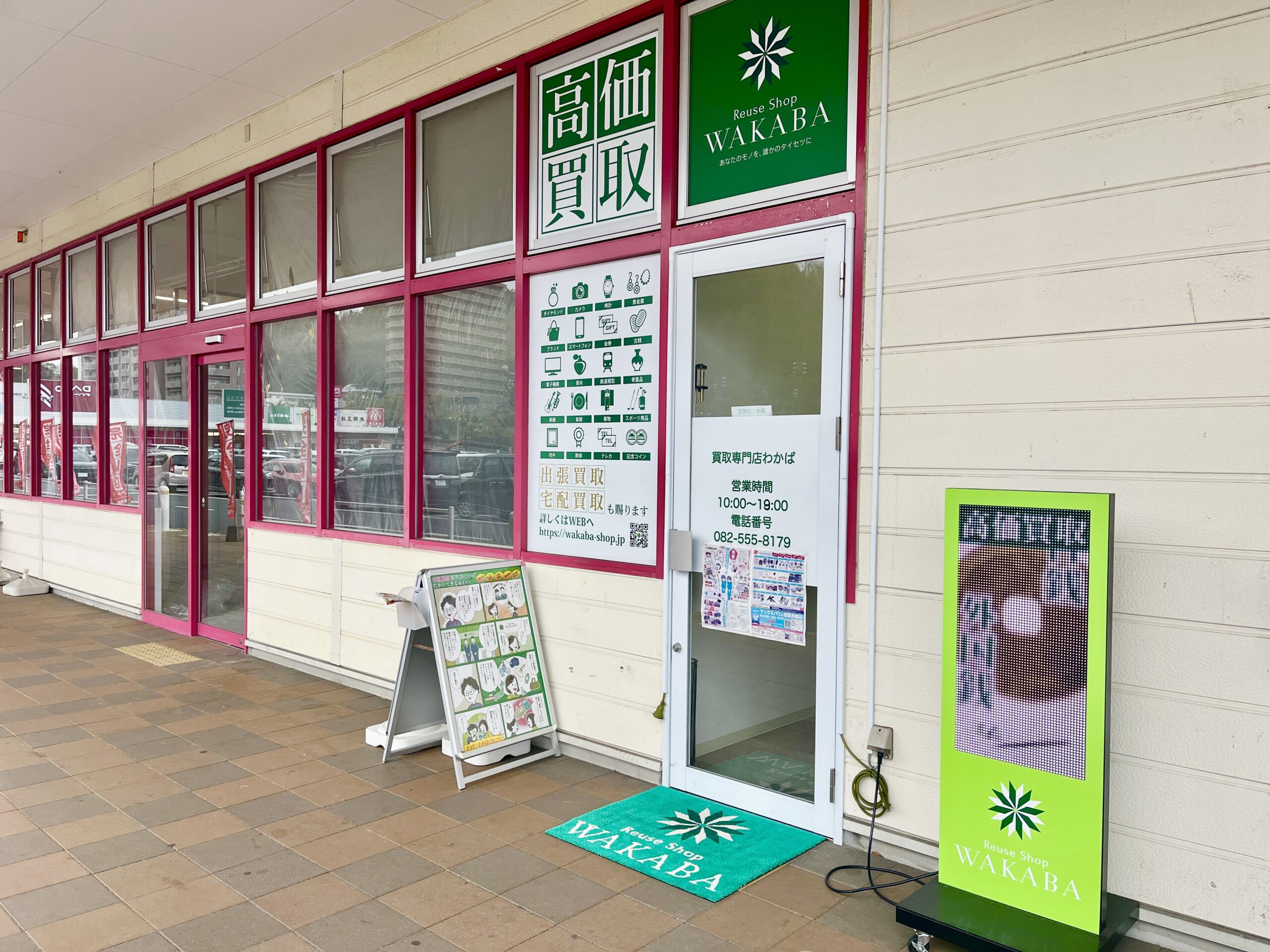 コチラは広島市安佐南区大塚西にあるリユースショップ「買取わかば マックスバリュ西風新都店」です。貴金属、ブランド品、切手、宝石など幅広いアイテムを扱っており、全国で250店舗以上を展開しています。