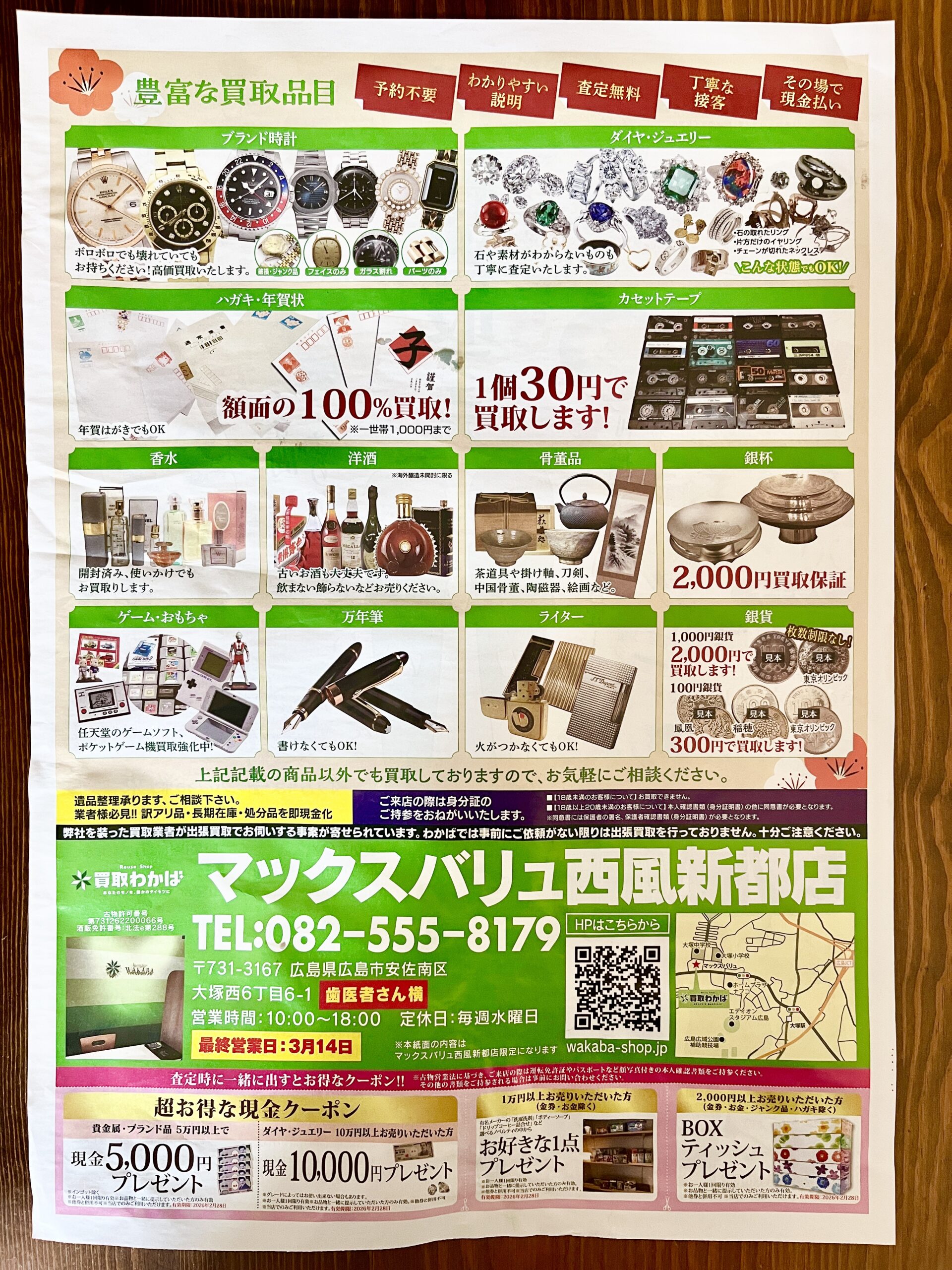 【閉店情報】安佐南区大塚西の「買取店わかば マックスバリュ西風新都店」が3/14(土)に残念ながら閉店。『閉店前特別買取フェア』を開催中。