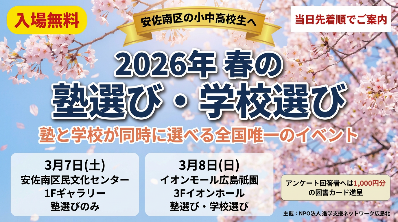 広島市安佐南区の小中高校生のためのイベント『2026年春の塾選び・学校選び』が開催されます。2026年3/7(土)・8(日)の2日間です。主催は、社会教育の推進と子どもの健全育成を目的として活動するNPO法人進学支援ネットワーク広島北です。安佐南区・安佐北区の地域の塾が協力し合って、今回のようなイベントを開催しています。