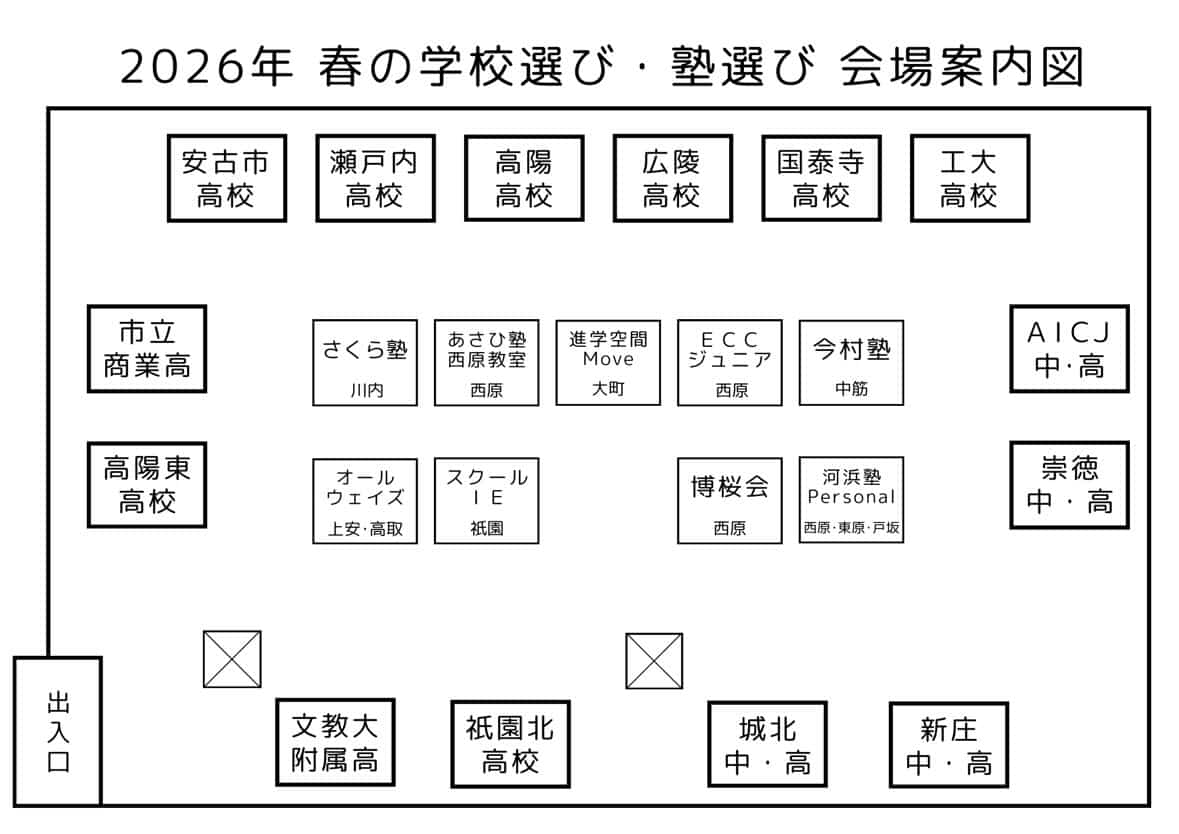 『2026年春の塾選び・学校選び』は広島市安佐南区の実力派個人塾が集まり、塾の雰囲気や勉強の気になることや困ったことなどが個別ブースで1対1で相談できるのが特徴です。2日目の3/8(日)は地元の私立中・高校や公立高校も参加します。
