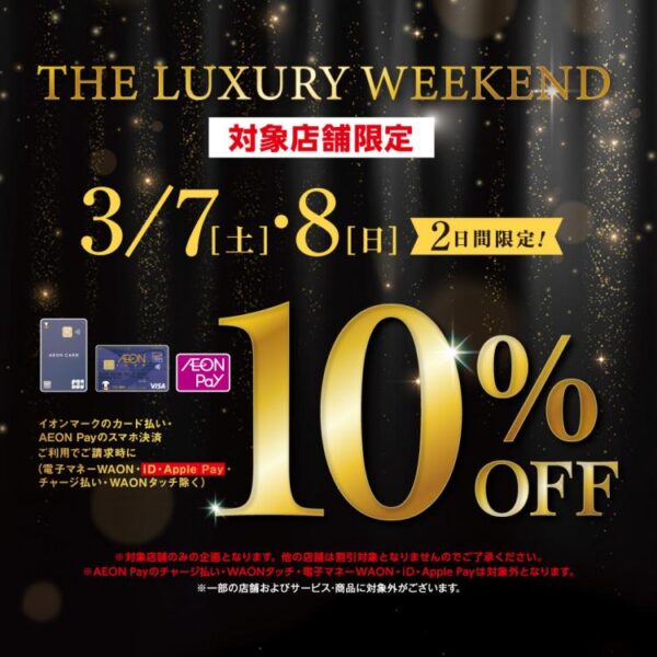 期間中にイオンマークのカード払いや、AEON Payのスマホ決済を利用すると、請求時に10%OFFになるみたいです。対象となるのは、2Fのアウトレットフロアにある海外有名ブランド9店舗だそうです。