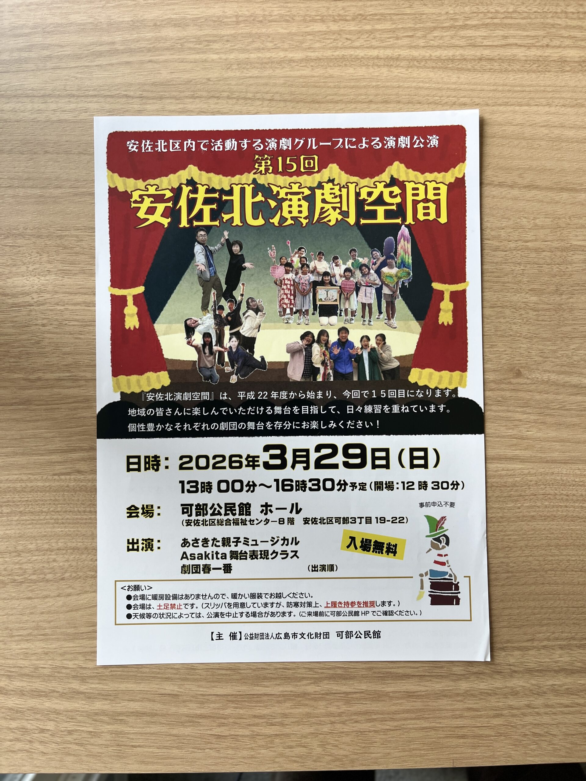 【演劇が好き】3/29(日)、安佐北区可部の可部公民館で『第15回 安佐北演劇空間』が開催。親子ミュージカルや舞台表現クラスなど個性豊かな3劇団が登場!